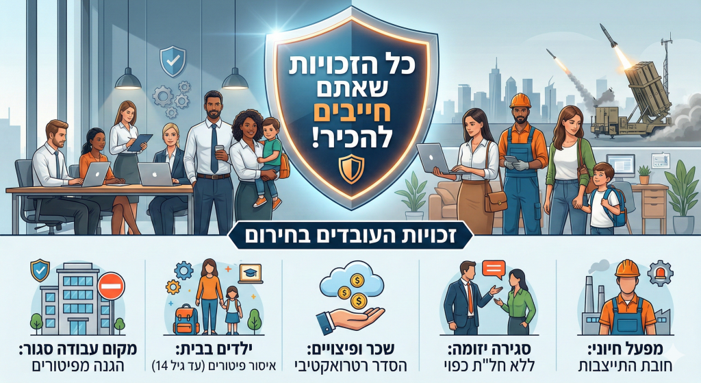 זכויות עובדים במלחמה שאגת הארי 2026 המצב מתוח, מסגרות החינוך נסגרות, וחלקנו לא יכולים או לא מורשים להגיע לעבודה עקב המצב הביטחוני. כדי לעשות קצת סדר בבלאגן, ריכזנו עבורכם את המידע המלא והמעודכן על הזכויות שלכם בעבודה בשעת חירום:  1. מקום העבודה נסגר בהוראת פיקוד העורף? אסור לפטר אתכם! אם אין במקום העבודה מרחב מוגן […]